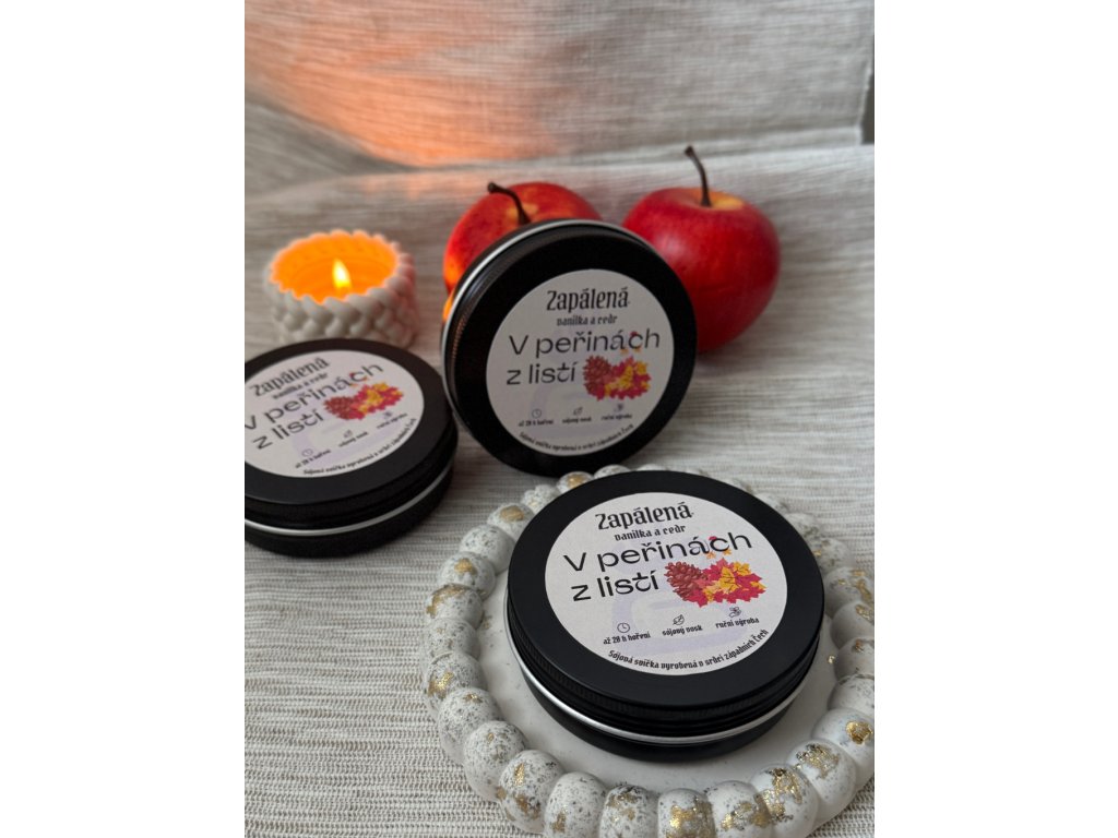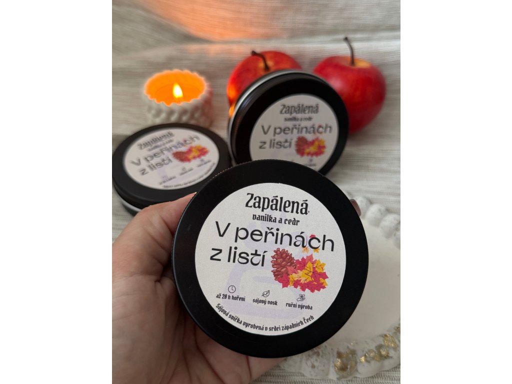 Sametový cedr a jemná vanilka v elegantní černé plechovce. Sójová svíčka V Peřinách z listí hoří čistě a během chvilky zútulní každý večer.