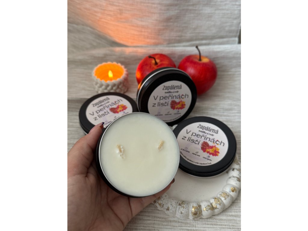 Pootoč víčko, zapal a nech prostor ztišit – Cedr & Vanilka se rozvine do pár minut a obalí tě měkkým teplem. Sójová svíčka V Peřinách z listí je ručně odlévaná v ČR ze 100% sójového vosku, hoří krásně čistě a její tichý plamínek zve k pomalému dýchání, knize i malé večerní meditaci. Plechovku snadno přibalíš do kabelky nebo na víkend – domácí pohodu si tak vezmeš s sebou. 🕯️